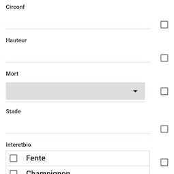 Pour l’encodage un formulaire Qfield a été mis au point. Il permet un encodage numérique sur le terrain et permet une localisation instantanée des arbres. Ce formulaire Qfield reprend l’ensemble des données à encoder (circonférence ,essence , types de micro-habitats, volume au sol, ... ) et permet un encodage rapide via un système de listes déroulantes et cases à cocher.